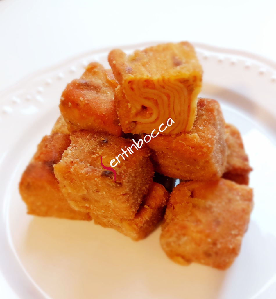 PASSATE OGNI CUBETTO PRIMA NELL’UOVO E POI NEL PANE GRATTUGIATO, FACENDOLO ADERIRE BENE IN OGNI LATO.